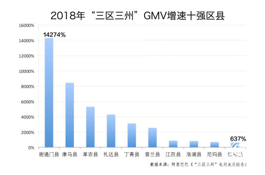 數據顯示,2018年,“三區三州”209個區縣,共有53個區縣網絡銷售額(GMV)翻番;增速最快的10個區縣,西藏占9席,排在第一的日喀則市謝通門縣,GMV同比增長142倍。