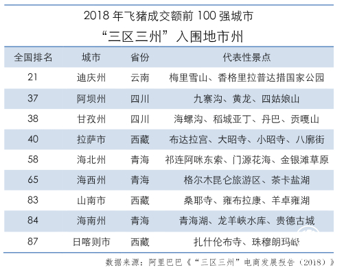 旅游產品受物流等硬件因素影響較小。2018年,飛豬線上成交額國內城市前100名中,有9個城市來自“三區三州”;云南迪慶州排在全國第21位。迪慶、甘孜兩州進入增速榜的前20名,分列第11和第20名。