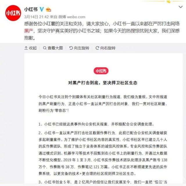 對此,小紅書官方微博發布聲明稱, 2019年1至3月,小紅書反作弊技術團隊處理涉及黑產賬號138萬個,作弊賬號38萬,作弊筆記121萬篇。小紅書正在不斷搭建更先進的反作弊系統,以更完備的技術+更合理的社區規則捍衛社區生態。