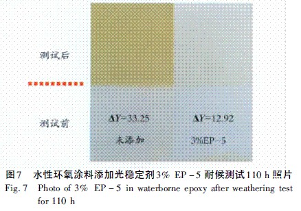由圖6試驗結果可以發現,當涂裝添加3%EP-5水性光穩定劑的水性環氧涂料,膜厚為20μm時,可以得到最低黃變值,耐候效果最好。相對于增加EP-5的有效濃度,增加涂料的膜厚不是一種最佳的選擇。圖7為實際水性環氧涂料耐候測試照片。