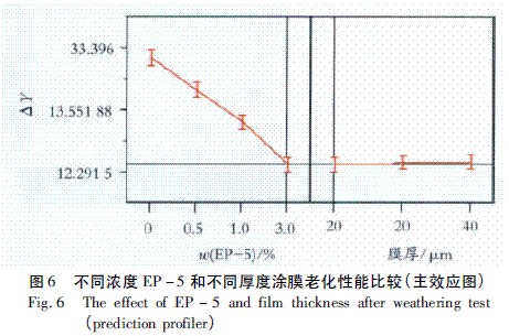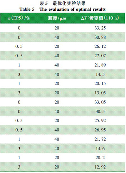 根據表2實驗結果,將篩選出的最佳水性光穩定劑EP-5,添加于水性環氧樹脂中,在不同濃度和不同涂膜厚度下進行最優化探討,實驗結果如表5所示。