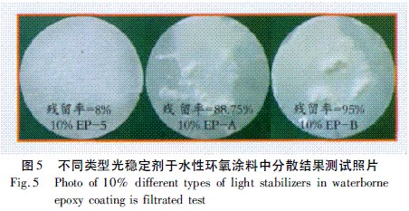 由圖4試驗結果可以發現,EP-5殘留率最少為8%,分散效果最佳,EP-A和EP-B分散過濾后殘留物最多,分散效果不佳。圖5為實際水性環氧涂料過濾測試照片。