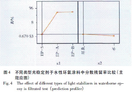 x1表示使用不同類型光穩定劑EP-5、EP-A和EP-B,x2表示不同溶液體系環氧和水,縱軸表示經分散過濾后濾紙上殘留率R,值越小,代表分散效果越好,值愈大,代表分散效果越差。