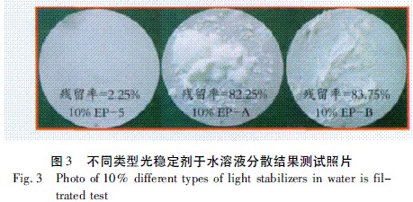由圖2試驗結果可以發現,EP-5殘留率最少為2.25%,分散效果最佳,EP-A和EP-B分散過濾后殘留物較多,分散效果不佳。圖3為實際水溶液過濾測試照片。