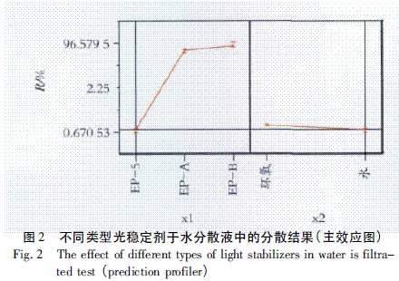 不同類型光穩定劑對不同類型溶液分散結果如圖2所示。橫坐標分別為x1和x2。主效應圖說明:根據表2真實的實驗結果利用統計軟件JMPVERSION5.0分析繪制圖2主效應圖回歸模型理論的趨勢結果,如果圖2跟表2愈相近,表示所找到的[回歸模型理論]愈能解釋真實結果,主效應圖,不但能說明最佳、最差組合,還能看出影響度斜率及預測值。