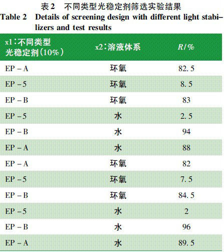 2以水性環氧涂料為溶劑混合不同類型光穩定劑稱取10g不同類型光穩定劑見表1,加入100g水性環氧涂料中,混合攪拌5min,再將溶液倒入含2#濾紙的水流抽器機抽濾后,在60℃烘干后稱質量,計算其在濾紙上的殘留率R。