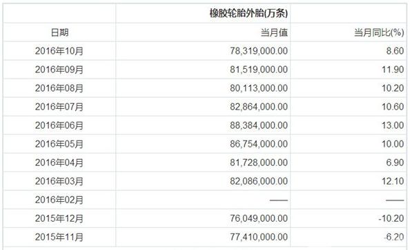 據前瞻數據庫數據顯示,2016年10月我國橡膠輪胎外胎產量7832億條,當月同比增長8.6%。
