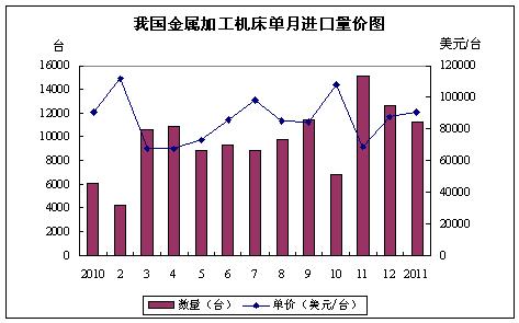 2月14日,我國海關發布的最新統計數據顯示,2011年1月,我國進口金屬加工機床11277臺,比2010年12月(環比)的12647臺下降了10.83%,但比2010年1月(同比)的6187臺大幅增長85.23%;進口金額約為10.22億美元,環比下降7.69%,同比則增長85.64%;進口平均單價為90634美元/臺,環比增長3.52%,同比微增0.22%。