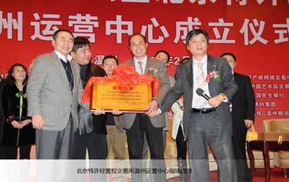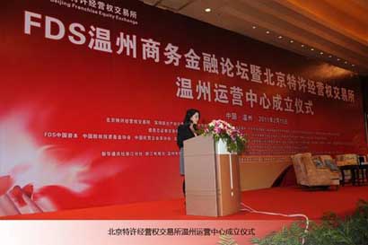 2011年2月15日,北京特許經營權交易所溫州運營中心舉行了隆重的授牌儀式,包括北京特許經營權交易所、倫敦證券交易所、德意志證券交易所、深圳聯合產權交易所、北京金融資產交易所在內的國內外十大交易所及FDS中國資本、軟銀賽富、桃花源基金、花木蘭基金、銀河證券、民生銀行等在內的多只基金和金融機構借此機會齊聚甌城,為溫州這座商業之都帶來了廣闊的商務金融資源,并吸引了近600位溫州企業家參與同期舉行的論壇活動。