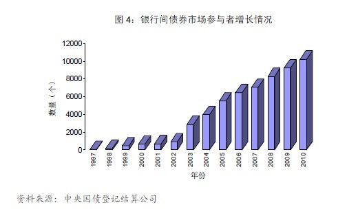 截至 2010年末,銀行間同業拆借市場參與者887家,比2009年末增加33家。銀行間債券市場參與主體10235個,包括各類金融機構和非金融機構投資者,以做市商為核心、金融機構為主體、其他機構投資者共同參與的多層市場結構更加完善,銀行間債券市場已成為各類市場主體進行投融資活動的重要平臺。