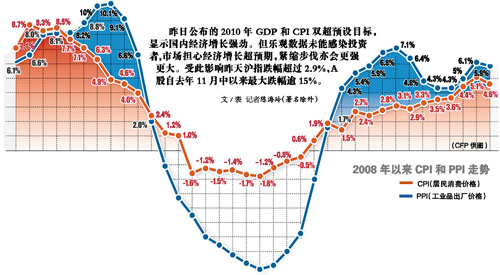 昨日公布的2010年GDP和CPI雙超預設目標,顯示國內經濟增長強勁。但樂觀數據未能感染投資者,市場擔心經濟增長超預期,緊縮步伐亦會更強更大。受此影響昨天滬指跌幅超過2.9%,A股自去年11月中以來最大跌幅逾15%。