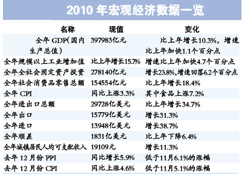 2010年GDP同比增長10.3% CPI同比增長3.3%