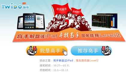 活動期間多臺IPAD,200套高端行情軟件LEVEL2,獎品眾多,無論是股市高手還是小散一枚,只要參與就有機會免費拿禮品。金秋三部曲解盤大賽,從11月1日持續到11月13日,天天都有獎品贈送。詳細請查閱:HTTP://WWW.TWIOO.COM/SPECIAL/JQHUODONG_JIEPAN