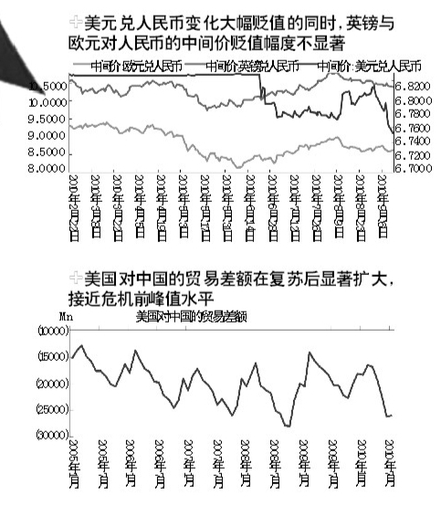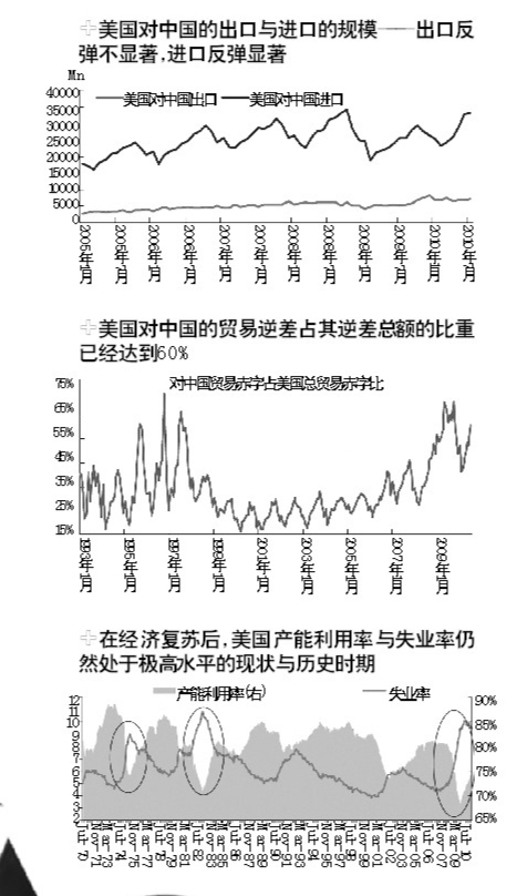 中信建投證券研究發展部分析師吳旻分析,中國對于美國而言,是第一大貿易赤字貢獻國;雖然在經濟危機中,中美之間的再平衡已經有所啟動,但是自去年下半年開始,隨著復蘇的推進,中美的不平衡反而有所加劇。美國對于中國的出口恢復緩慢,而對于中國的進口額則快速反彈,中美之間的貿易赤字占美國的貿易赤字比重逐漸接近60%,開始達到危機前的水平。由此,推動人民幣兌美元升值,是美國重塑其商品與服務競爭力的重要手段。
