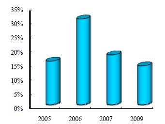 目前,全國有20多家生產能力在5萬噸以上的鋼結構加工企業,其裝備水平、生產技術、經營能力都已接近國際水平。從目前來看,我國的市場集中度不算很高,與美國MBMA金屬建筑生產協會相比,我國的市場集中度還有提升空間。2009年采用我們估算的鋼結構產量看,前20名鋼結構企業的市場份額為14%,前40名的市場份額必然小于28%,2009年,美國的MBMA會員共43家的市場份額為39%。