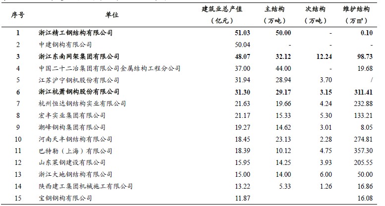 2009年鋼結構行業企業產值排名中,精工鋼構排名第一,東南網架排名第二,杭蕭鋼構排名第六。具有集團優勢的中建鋼構與中冶集團的鋼構公司分別為第二、第四名。具有上游優勢的萊鋼、寶鋼也榜上有名。