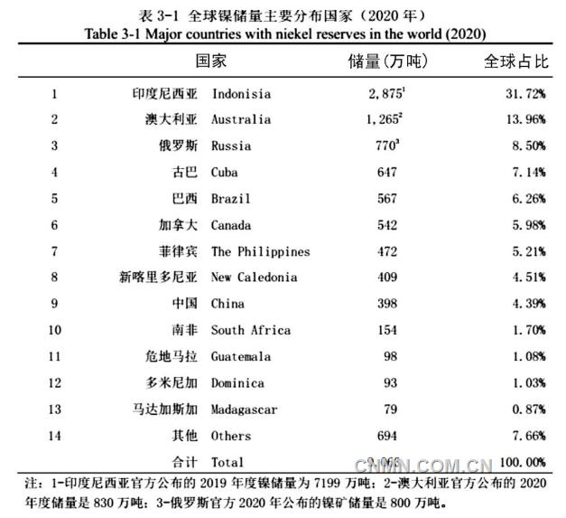 中國地質調查局發布的《全球鋰、鈷、鎳、錫、鉀鹽礦產資源儲量評估報告(2021)》顯示,截至2020年,全球鎳礦儲量為9063萬噸,資源量為2.6億噸,印度尼西亞位居全球儲量第一,澳大利亞、俄羅斯等國資源豐富。