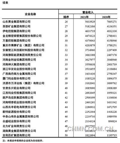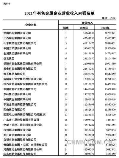 有色協會對2021年有色金屬企業營業收入進行排序。2021年底,有色金屬企業營業收入50強的入圍底線擴大到182億元,比2020年的入圍底線增加了78億元。2021年,入圍營業收入50強的企業中,營業收入超1000億元的企業達到18家,其中,超2000億元的企業有9家。在入圍營業收入50強的企業中,國有企業26家,民營企業24家;銅鎳企業11家,鋁企業16家,鉛鋅企業7家,綜合及其他金屬品種企業16家。