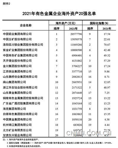 國際化指數接近和超過50%企業5家。2021年,有色金屬企業海外資產20強企業中,國際化指數接近和超過50%企業有5家。這5家企業依次是:北方礦業有限責任公司、洛陽欒川鉬業集團股份有限公司、天齊鋰業股份有限公司、中國有色礦業集團有限公司和浙江華友鈷業股份有限公司。(有色協會)