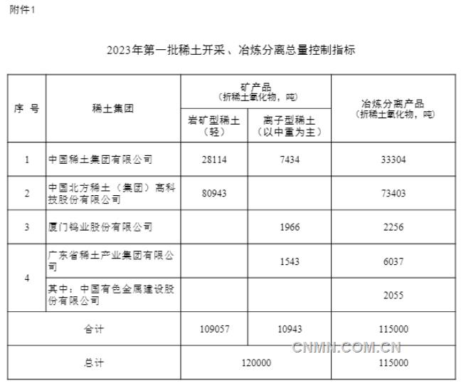 1. 2023年第一批稀土開采、冶煉分離總量控制指標