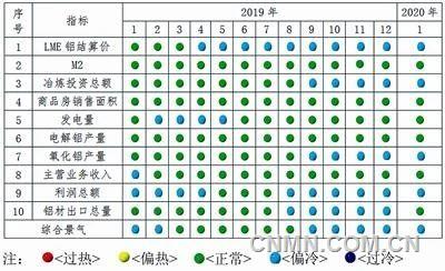 由中色鋁冶煉產業景氣信號燈(見表2)可見,2020年1月,在構成鋁冶煉產業景氣指數的10個指標中,LME鋁結算價、鋁冶煉投資總額、氧化鋁產量、利潤總額等4個指標繼續位于“偏冷”區間;M2、商品房銷售面積、發電量、電解鋁產量、主營業務收入和鋁材出口總量等6個指標處于“正常”區間。