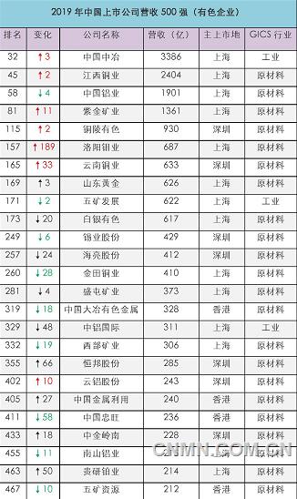 近日,根據2019年營業收入排名,由東方財富網公布的中國上市公司500強榜單出爐,有色行業25家企業上榜。其中,上榜的有色企業位居前五名的是:中國中冶、江西銅業、中國鋁業、紫金礦業、銅陵有色,分別位居500強榜單中第32、45、58、81、115名。位居6-25位的上榜有色企業依次為:洛陽鉬業、云南銅業、山東黃金、五礦發展、白銀有色、錫業股份、海亮股份、金田銅業、盛屯礦業、中國大冶有色金屬、中鋁國際、西部礦業、恒邦股份、云鋁股份、中國金屬利用、中國忠旺、中金嶺南、南山鋁業、貴研鉑業、五礦資源。在此次排名中,12家有色企業排名位次較上年有所上升,其中,最多的是洛陽鉬業,上升189位,排名為157位。較上年排名位次下降最多的是中國忠旺,下降58位,排名為411位。