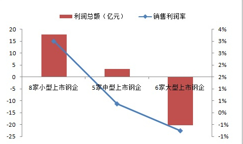 據筆者統計,截至目前有20家上市鋼企公布2013年經營情況,其中寶鋼股份全年實現利潤80.1億元,而其余19加上市鋼企僅實現利潤7058萬元。剔除寶鋼股份,在19家上市鋼企中,8家小型上市鋼企(鋼產量500萬噸)實現利潤17.7億元,銷售利潤率為3%;5家中型上市鋼企(鋼產量500-1000萬噸)實現利潤3.24億元,銷售利潤率為0.37%;6家大型上市鋼企(鋼產量1000萬噸以上)實現虧損20.24億元,銷售利潤率僅為-0.76%。