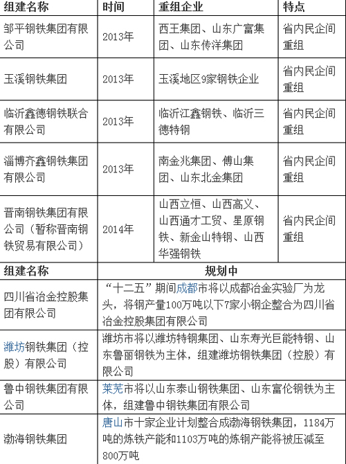 2013年以來,國內鋼企兼并重組的主體悄然發生改變。往年活躍在并購前線的大型鋼企集體沉默,反而是多家民營中小鋼企進行了聯合重組。從表一來看,完成聯合重組的鄒平鋼鐵集團、臨沂鑫德鋼鐵、淄博齊鑫鋼鐵集團、晉南鋼鐵集團這四家企業有共同的特點:聯合重組的主體大多是百萬噸級的小鋼企、且均是省內民營鋼企之間的聯合,重組后的規模突破或接近千萬噸級。同時,正在計劃重組中的幾家鋼企,也具備以上特點。