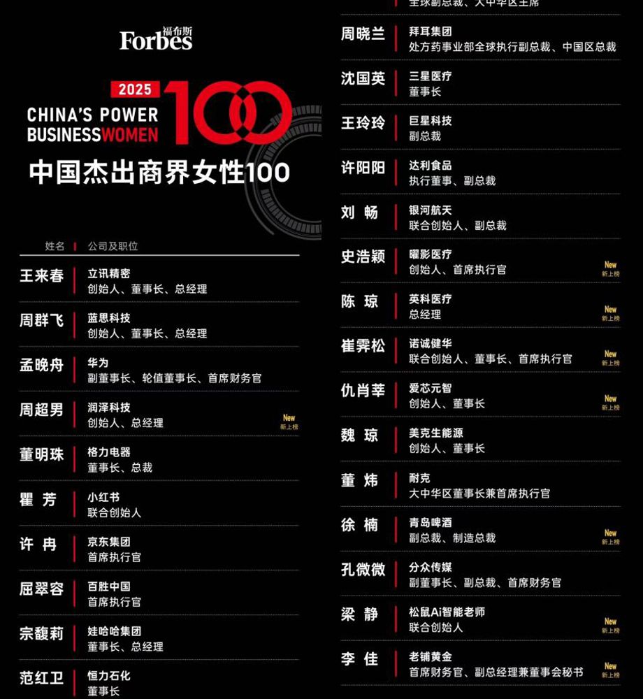 2025年3月8日,福布斯中國第11次發布“中國杰出商界女性100”榜單。該榜單覆蓋中國內地、香港、澳門三地上市企業女性高管、跨國公司在華女性負責人及獨角獸企業女性創始人,綜合經營業績、創新力、行業影響力等六項指標評選。