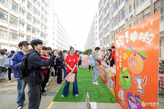 同時,在場外,健力寶也設置了品牌專屬互動區,亮眼的橙色主題展位、花樣玩法、精美產品和周邊禮品,吸引了眾多學子排起長龍,駐足打卡,進一步拉進了健力寶與年輕群體的鏈接,為民族品牌煥新更添青春氣息。