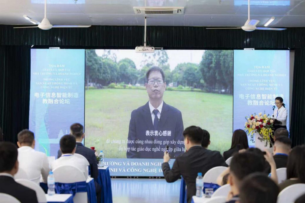 11月25日,電子信息智能制造產教融合論壇在越南北寧省慈山市越南李太祖學院成功舉辦。本次論壇由南寧職業技術大學、越南李太祖學院、中國—越南電子信息現代工匠學院及巨大教育科技集團聯合主辦,以“深化越中產教融合,共筑高素質工匠人才新通道”為主題,吸引中越雙方政府、院校及企業代表70余人參與。