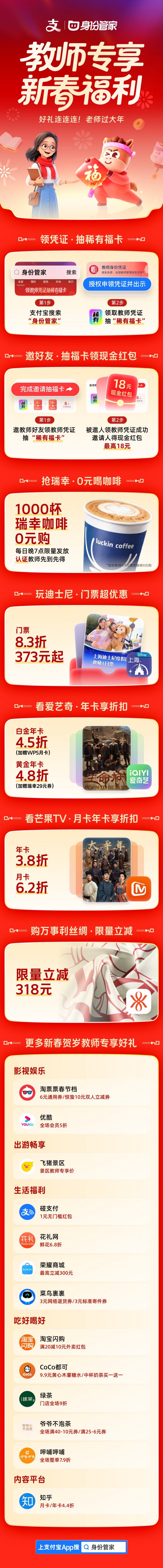 2026年農歷新春前夕,支付寶“身份管家”平臺聯合眾多商業品牌,在集福活動中踐行“尊師惠師”公益理念,通過數字化方式為全國教師提供專屬的新春福利,探索社會力量參與尊師重教的新路徑。