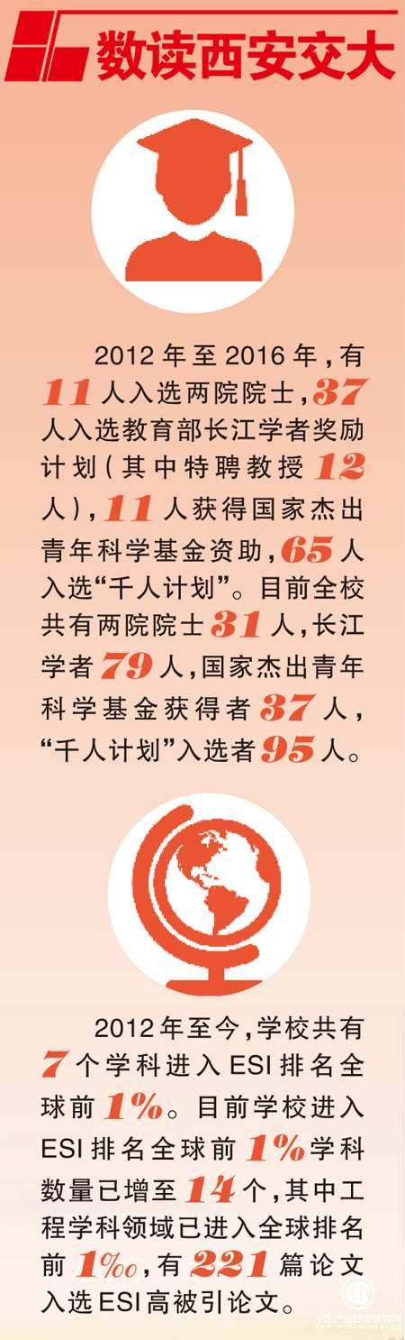 習近平總書記提出,要充分發揮高校人才薈萃、學科齊全、思想活躍、基礎雄厚的優勢,面向經濟建設主戰場,面向民生建設大領域,加強科學研究工作,加大科技創新力度,努力形成更多更先進的創新成果。西安交大堅持“三個面向”不斷邁出科技協同創新的堅實步伐:2017年新增2個學科進入ESI全球前1%,5年來新增7個學科進入ESI前1%,總數已達14個;2016年具有自主知識產權的煤炭高效利用和清潔無污染的變革性技術“水蒸煤”投入產業化運行;2016年落實“軍民融合”國家發展戰略的Z箍縮重大科技基礎設施,被教育部列入首批國家重大科技基礎設施培育項目等等,讓西安交大成為催化產業轉型升級的生力軍,全面提高大學服務經濟社會發展的貢獻度。