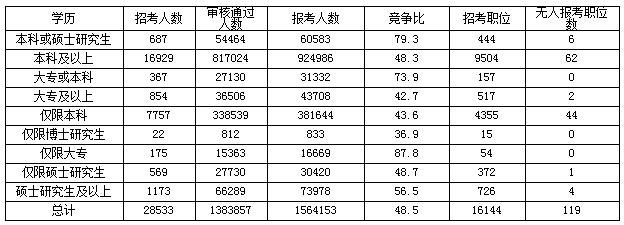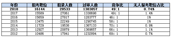 再次從無人報考職位來看,共有119個職位無人報考,占0.74%,比去年降低了一半。而從近7年的數據來看,除了2012年為0.7%,其余年份都比今年高,也可以看出考生報名更加向著均衡化發展。