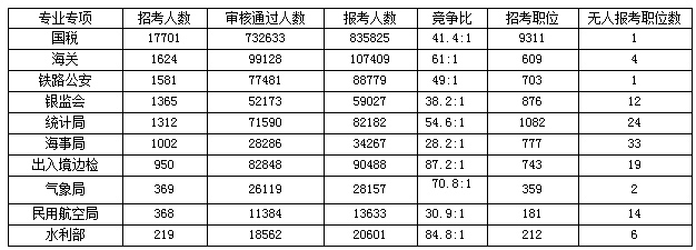 國稅是招錄大戶,共有73萬人通過審核,仍有10萬人待審中,無人報考職位僅剩1個。海關審核通過人數位居第二,有9.9萬人通過審核,競爭比為61:1。水利部競爭比最高,為85:1。國稅、海關、鐵路公安、銀監會、統計局、海事局、出入境邊檢、氣象局、民航、水利部是國考招錄大戶,也是考生報考的重點,競爭壓力都不小