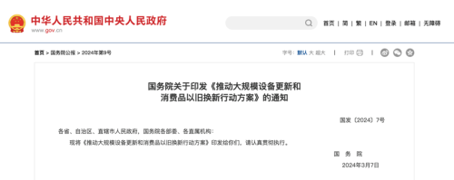 3月7日,《推動大規模設備更新和消費品以舊換新行動方案》正式發布。