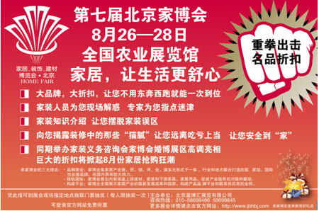 2011第七屆中國北京家居裝飾建材博覽會(以下簡稱家博會)即將于2011年8月26日在北京隆重開幕,其獨特的裝飾公司加裝修建材公司同臺展銷的模式得到了企業和消費者的一致認可,預計本屆家博會將吸引更多廠商和消費者參會。隨著北京家博會品牌影響和美譽度的不斷提升,眾多國內外企業希望借助家博會的平臺為本企業爭奪更多機會和市場。
