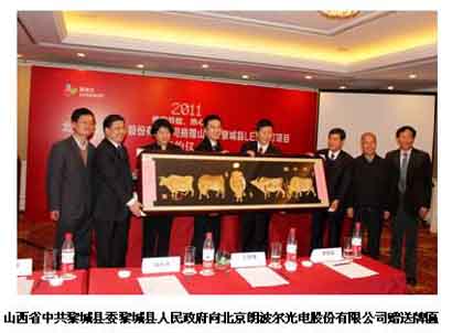 2011年1月23日下午,北京朗波爾光電股份有限公司捐贈革命老區山西省黎城縣LED路燈項目的簽約儀式在中國大飯店舉行。黎城縣人民政府常務副縣長孫彩虹代表受贈方與朗波爾光電公司黃力波董事長簽訂捐贈協議,接受LED節能路燈。中國照明學會理事長王錦燧、中國科學院半導體研究所所長李晉閩、中國照明電器協會副理事長兼秘書長劉升平,半導體照明研究中心副主任王軍喜以及山西省黎城縣委、縣政府的領導出席了儀式。