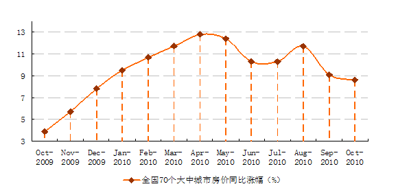 2010年年初,國內房價 持續走高,全國70個大中城市房價同比漲幅一舉突破10%的“準紅線”,引發了社會輿論的強烈不滿,國家開始著手進行調控。4月“新國十條”的出臺,使得全國70個大中城市房價同比漲幅由12.8%開始回落。