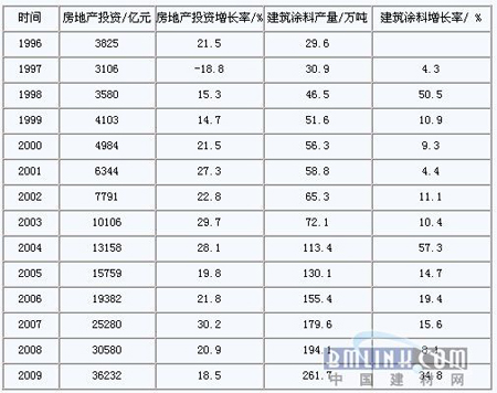 據相關數據統計顯示:2009年全年房地產開發投資36232億元,較2008年的30580億元同比增長18.5%,但增幅較2008年又回落了2個百分點。1996-2009年房地產投資和建筑涂料產量表說明建筑涂料產量和房地產投資有很好的相關性。另外,也從側面表明,翻新和重涂的建筑涂料用量不大。