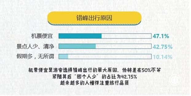 47.1%的人因機票價格更為合理而選擇錯峰出行,42.7%的人更在意錯峰出行景點人少,注重旅行的舒適度~