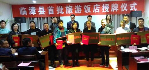 中國產業經濟信息網訊 為進一步整合、挖掘、包裝、宣傳臨漳旅游餐飲資源,打造獨具鄴城文化特色的旅游餐飲品牌,大力推進臨漳文化旅游產業化建設。3月16日下午,臨漳縣在金凱悅賓館隆重舉行首批旅游飯店授牌儀式。縣政協主席王萬錄、縣人大副主任祝紅娟、縣政府副縣長邢亞超、縣政協副主席王國強出席儀式,政協辦、政府辦、文明辦、文物旅游局、工商和食藥監局、旅游發展協會、烹飪家協會等相關單位負責人,以及我縣榮獲首批“旅游飯店”的12家飯店負責人、特邀嘉賓、媒體記者60余人參加儀式。