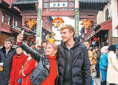 外國游客在南京夫子廟游玩時自拍留影。谷昌旺攝
