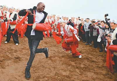 在陜西延安安塞區南溝進行的一場腰鼓演出結束后,一名外國游客與當地腰鼓手共同打起了腰鼓。新華社記者 劉 瀟攝