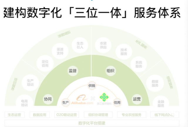 合作三方將在三方面進行試點:一是依托阿里巴巴數字平臺優勢,共建智慧農業大數據;二是發揮農合聯、供銷社系統的組織和資源優勢,共建“一縣一業”新模式;三是打造信用服務平臺,增強涉農金融服務保障能力。