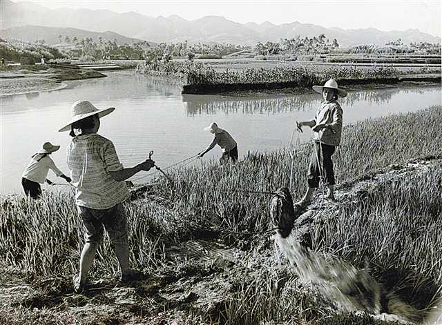 上世紀80年代改革開放初期,長壽縣葛蘭區農村農民頂著烈日,用各種工具引水抗旱。(資料圖片)