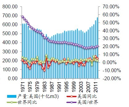 我國天然氣產量占世界的比例持續增加,但是依舊明顯低于美國。我國天然氣產量占世界產量的比例持續提高,由1970年的0.29%增加到2012年的3.19%,但是依舊明顯低于同期美國天然氣產量占比,盡管同期美國天然氣產量占比持續降低,從1970年的59.24%大幅減少到2012年的20.26%。