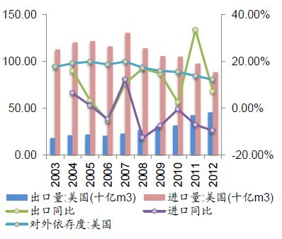 我國天然氣凈進口量增速明顯高于美國,對外依存度將持續攀升。我國從2006年開始進口天然氣,目前仍然是凈進口國且凈進口量持續增加,國內天然氣供不應求,2008-2012年凈進口量年均復合增速為129.28%,2012年達到378.6億m3。美國也是天然氣凈進口國,但是受益于頁巖氣開發取得突破性進展,近十年來凈進口量不斷減少,2003-2012年凈進口量年均復合增速為-8.42%,2012年減少到429.1億m3。我國天然氣對外依存度從2008年的5.99%上升到2012年的28.20%,隨著中亞天然氣管道及一批LNG接收站的投運,進口天然氣的比例還將不斷上升。而美國天然氣對外依存度不斷降低,從2003年的17.8%降低到2012年的12.26%,主要是收益于頁巖氣開發取得重大突破。根據已簽署的合同,到2015年我國年進口天然氣量約935億m3,相比2010年底增長450%;對外依存度預計將從2010年的15.47%提高到2015年的35%。
