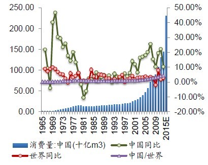 圖5:我國天然氣消費量快速增長,中國占比持續增加