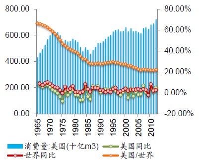 圖6:美國天然氣消費量增速較慢,美國占比持續減少